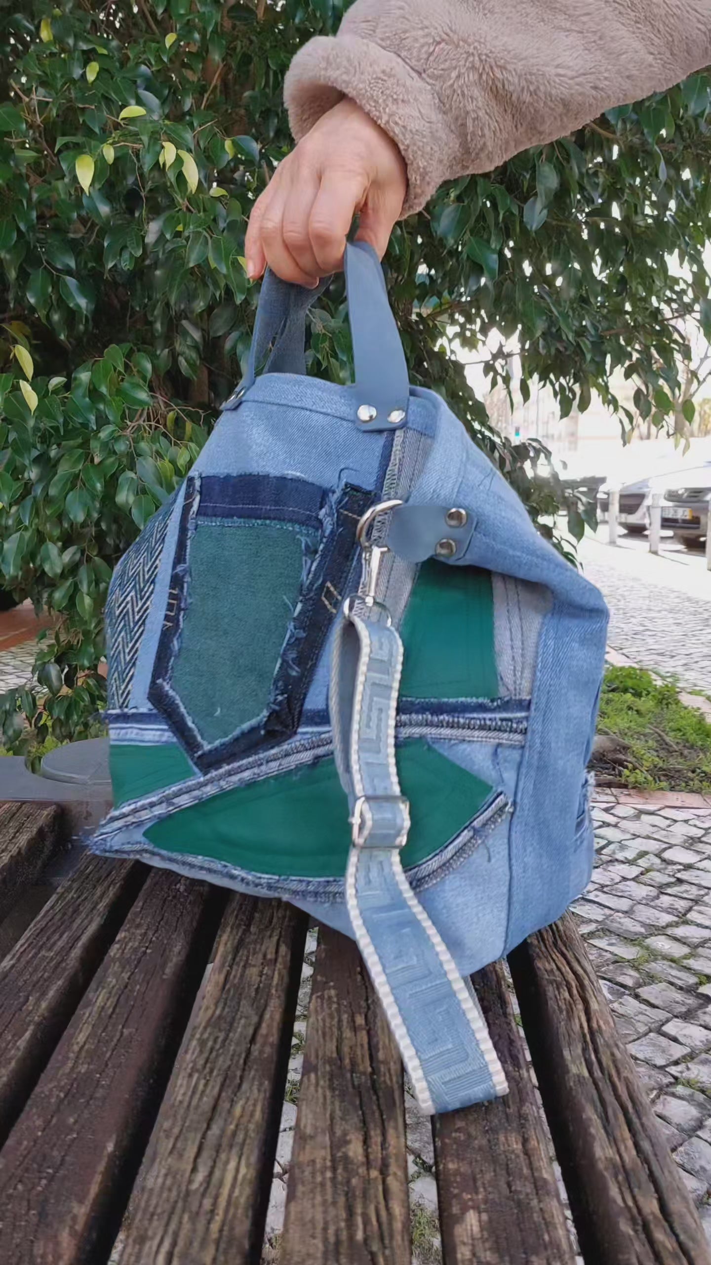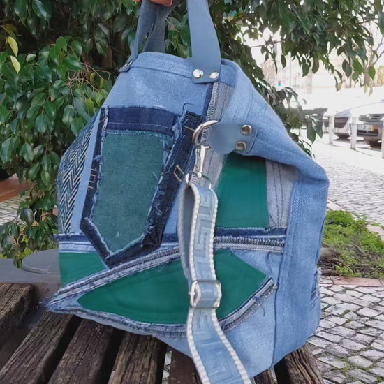 Green Eco Friendly Bag | Handmade Denim and Green Leather Handbag | High-Quality Recycled Jeans Bag