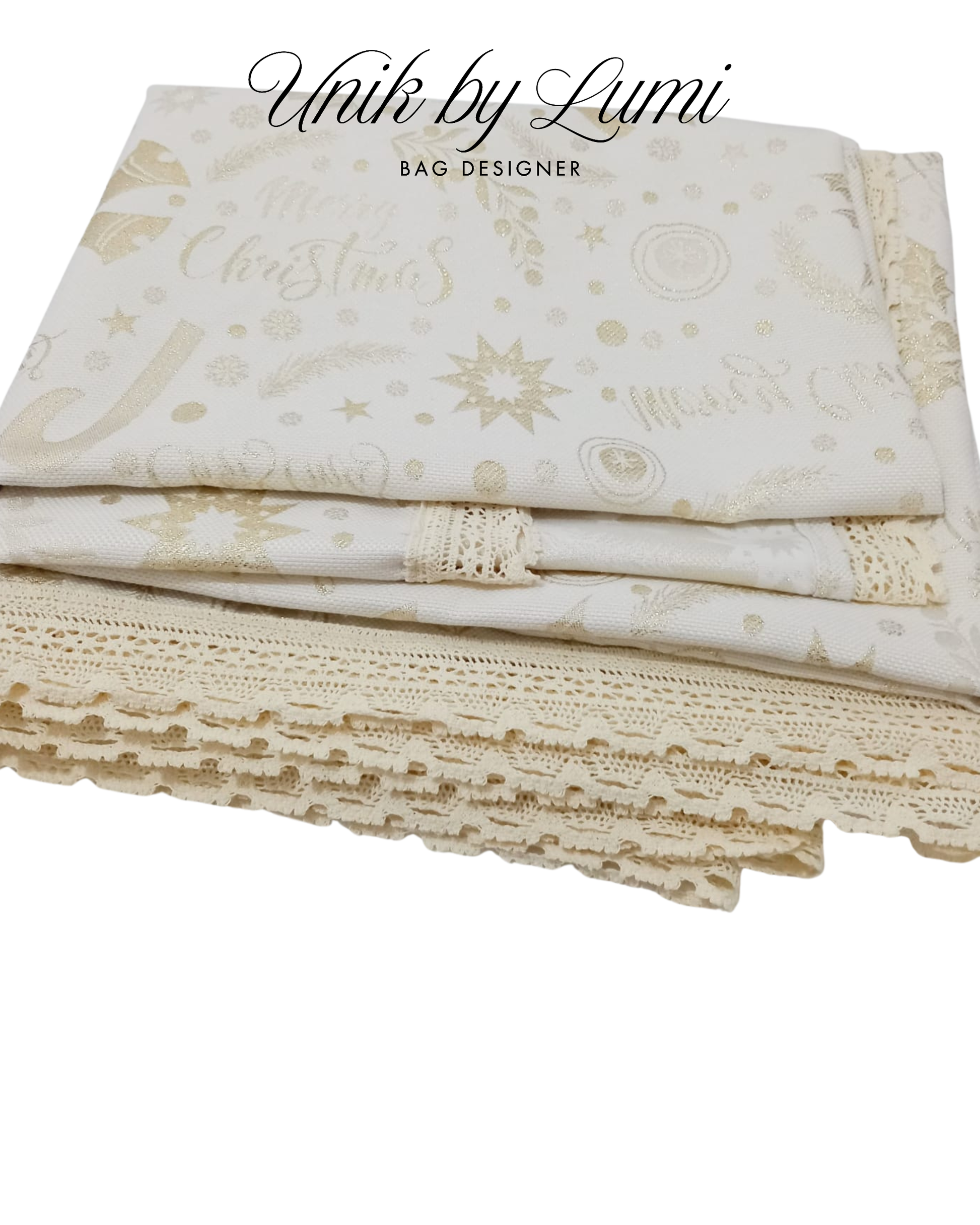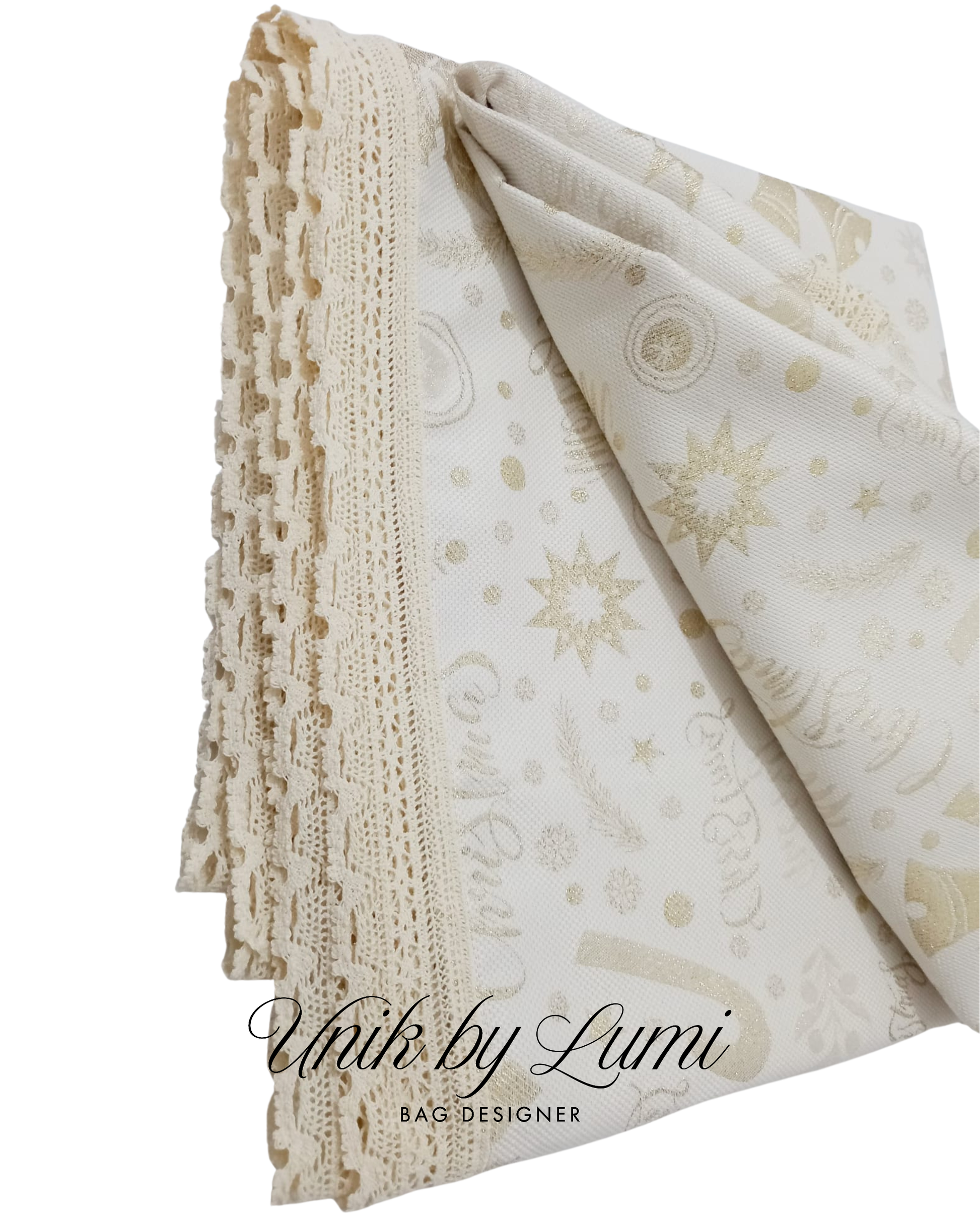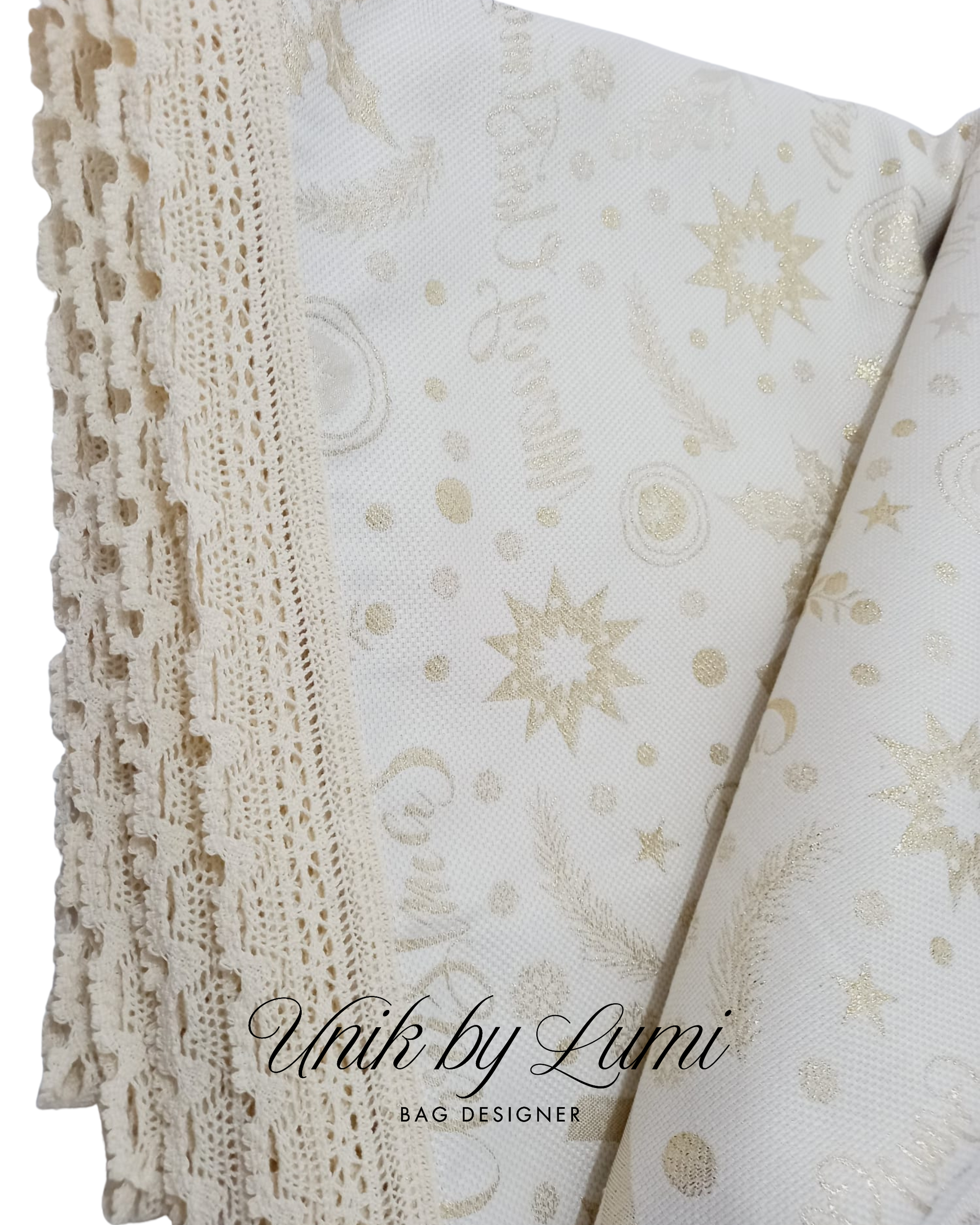 Uma toalha de mesa dourada, concebida para tornar cada refeição de Natal especial. Fabricada com 65% algodão e 35% poliéster, para um acabamento suave e resistente, e com delicados detalhes em renda – perfeita para dar um toque festivo e um luxo discreto à sua mesa.