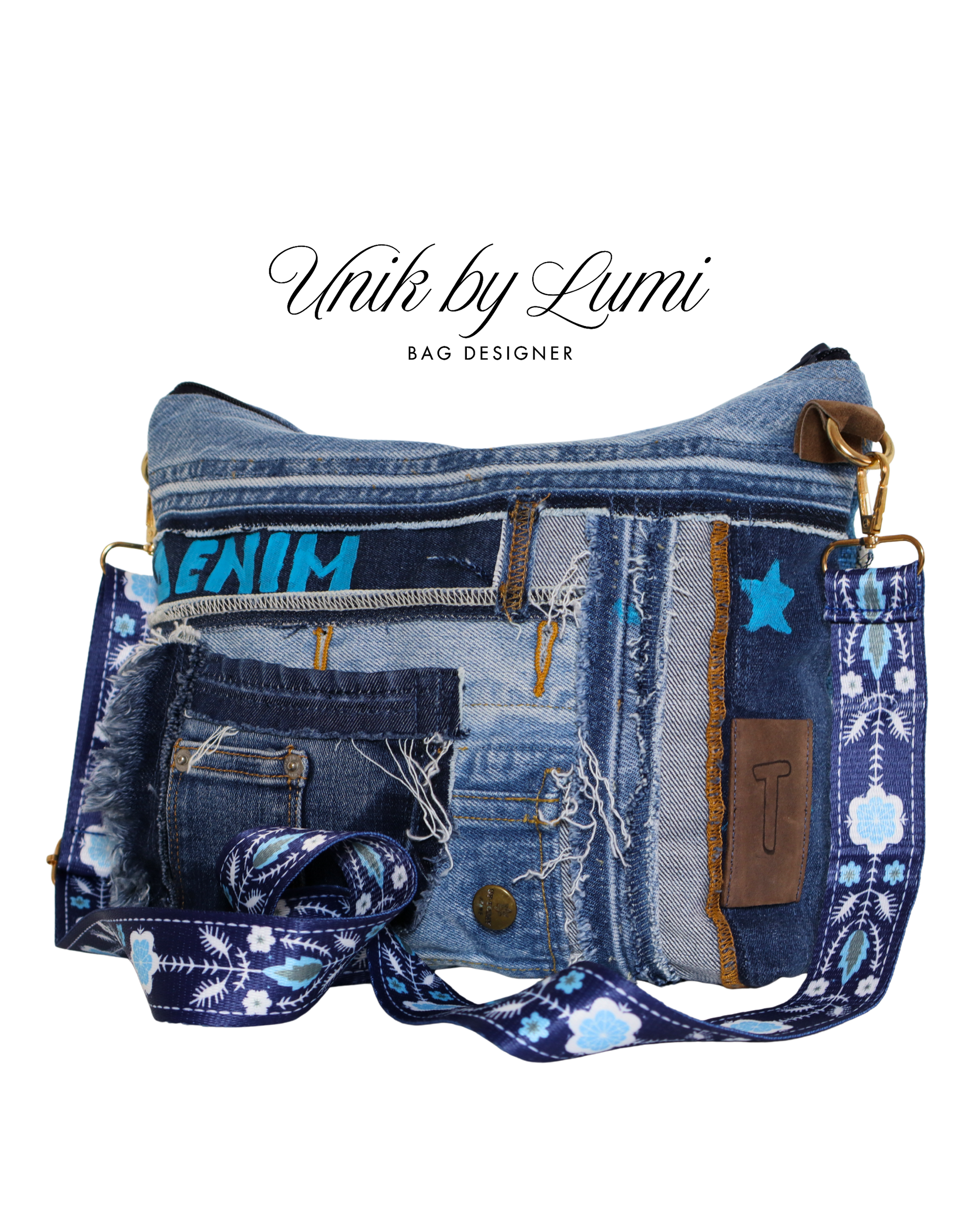 Bolsa única e feita com materiais reciclados | Mistura de ganga e couro